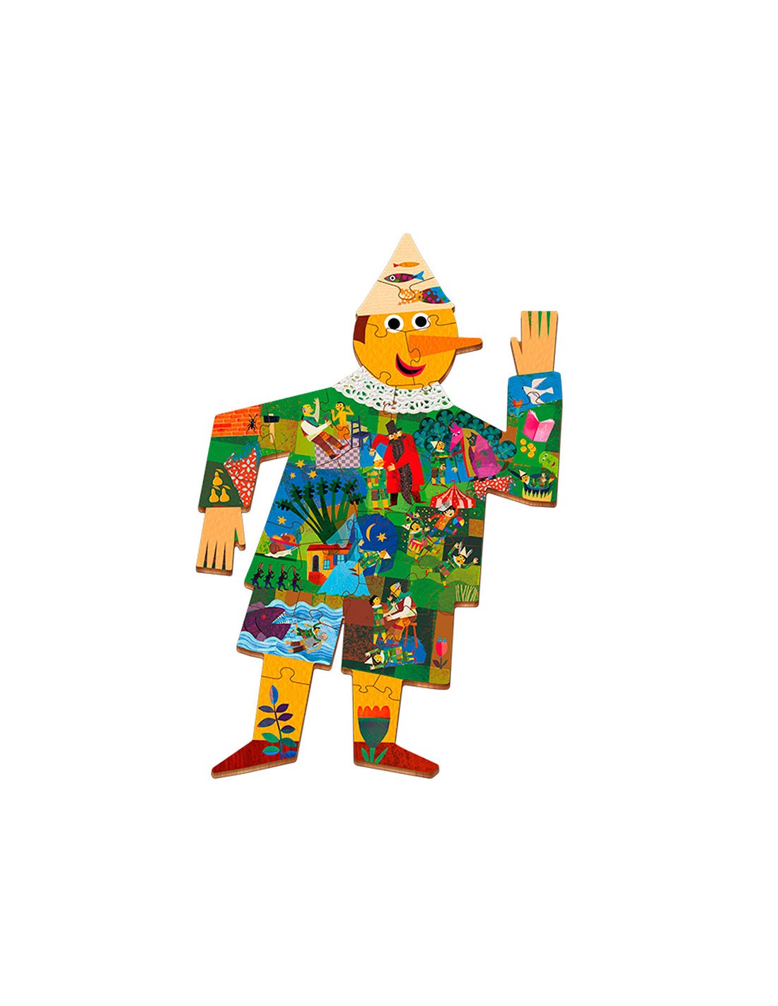A medida que se vaya montando este precioso puzzle de madera de Pinocho, el cuento irá tomando forma. El puzzle tiene forma de silueta de Pinocho y su ropaje irá contando el cuento.