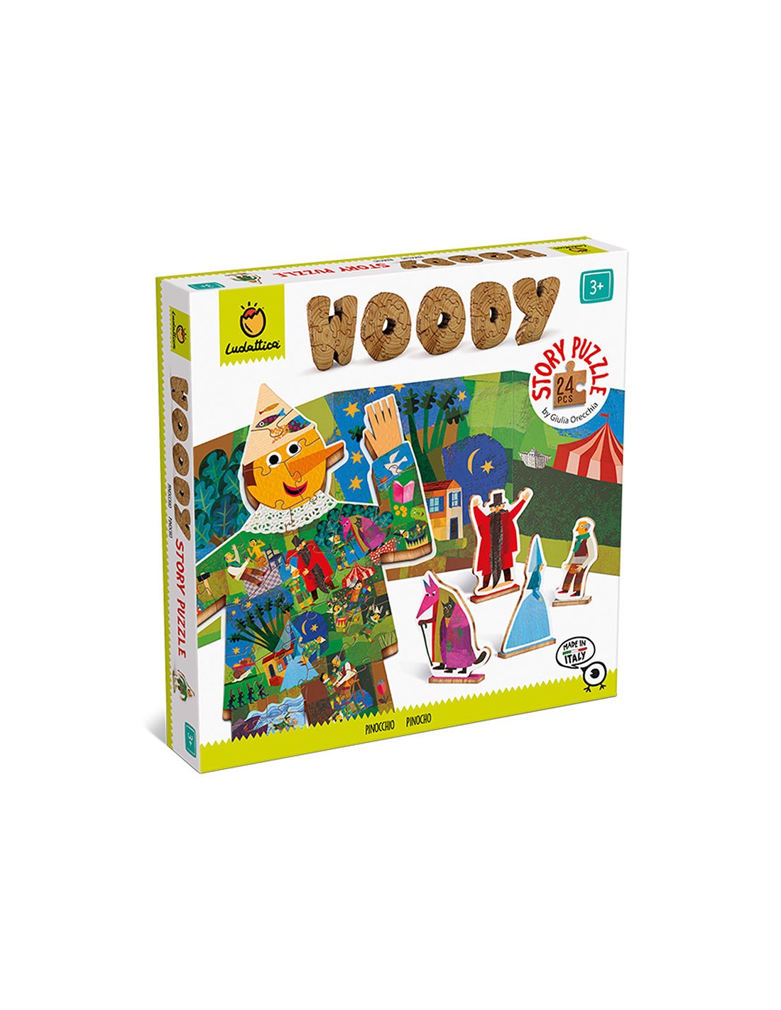 Precioso puzzle de madera de 24 piezas, con lal figura de Pinocho. A medida que se vaya formando la figura de Pinocho, irá apareciendo la historia de este personaje. Contiene además un escenario con 5 figuras de madera con base de apoyo para poder representar el cuento.