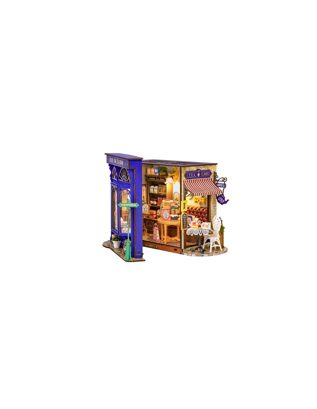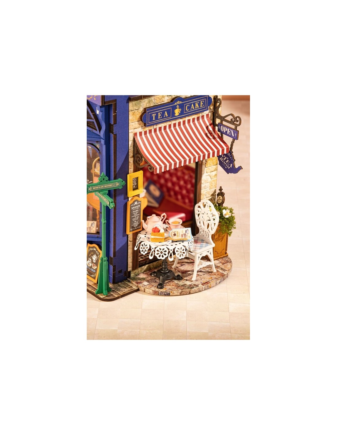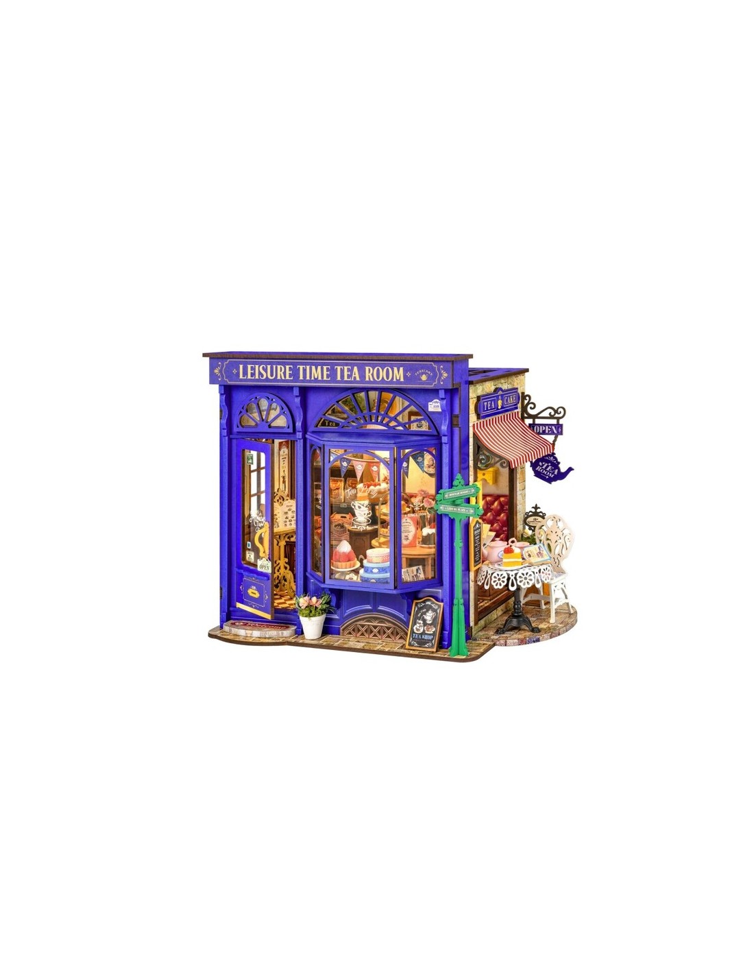 Descubre la magia del bricolaje con el Rolife Leisure Time Tea Room, una encantadora casa en miniatura de estilo europeo compuesta por 304 piezas. Este kit DIY recrea una acogedora tetería con fachada azul, vitrinas repletas de dulces, zona al aire libre y detalles vintage como letreros metálicos y suelos de baldosa.