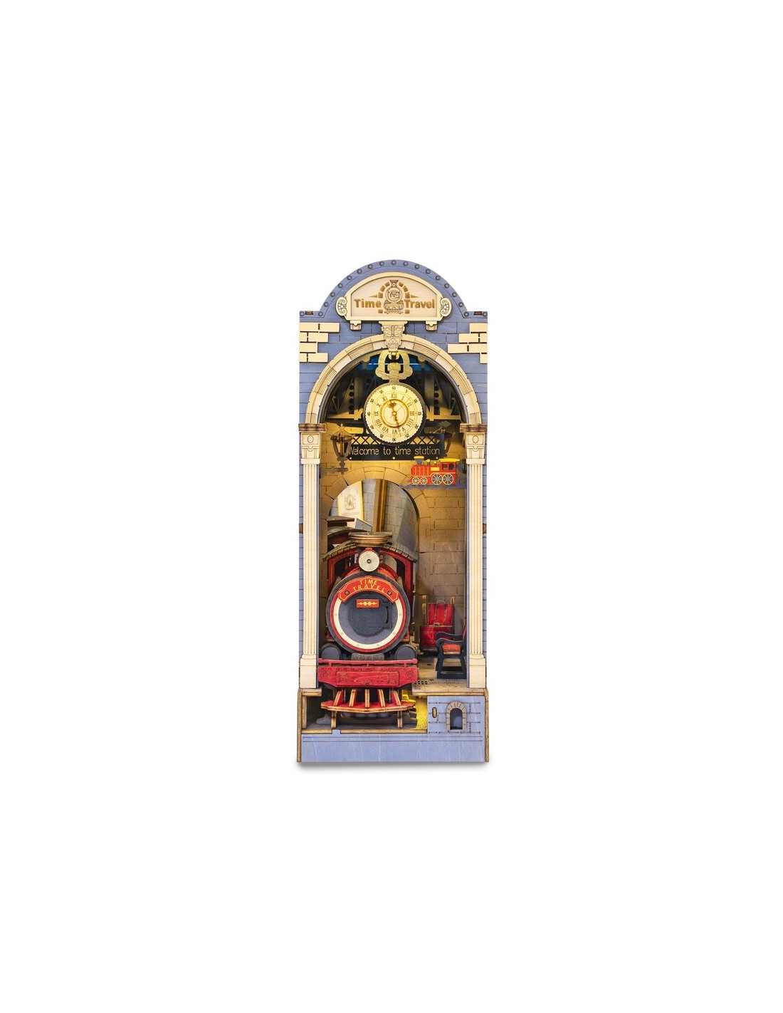 Explora un mundo retrofuturista con el TIME TRAVEL Sujetalibros, una maqueta DIY en miniatura que fusiona el estilo steampunk con la funcionalidad de un sujetalibros decorativo. Este kit incluye piezas detalladas que recrean una estación de tren del tiempo, con engranajes, relojes, vitrales y una cálida iluminación LED que da vida a la escena.