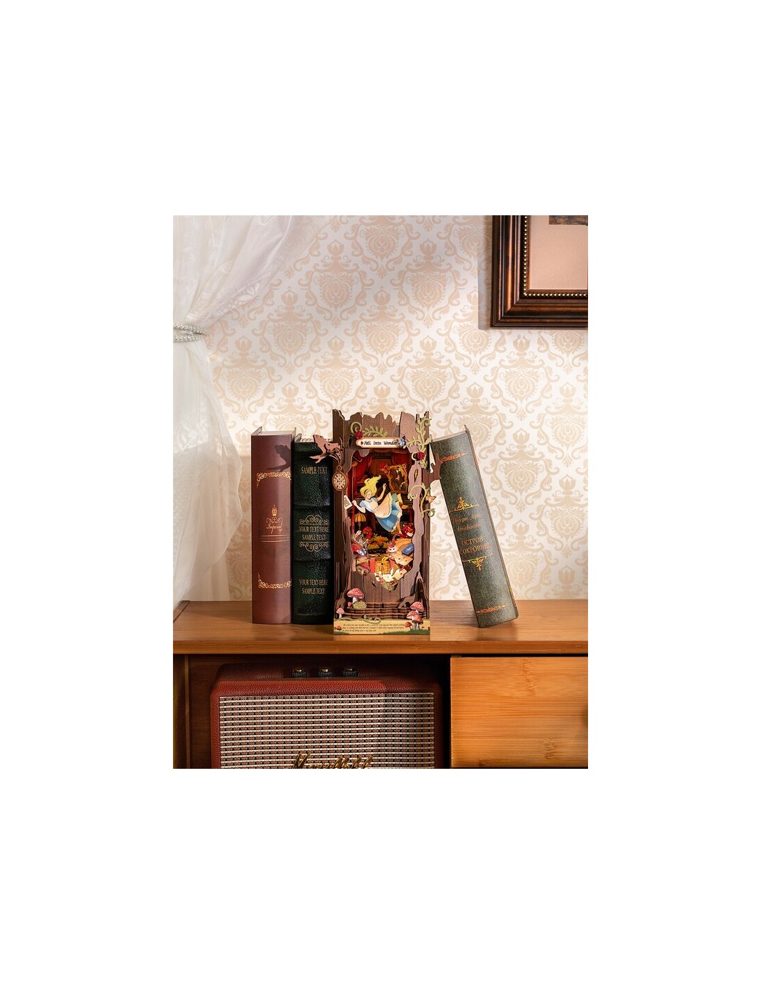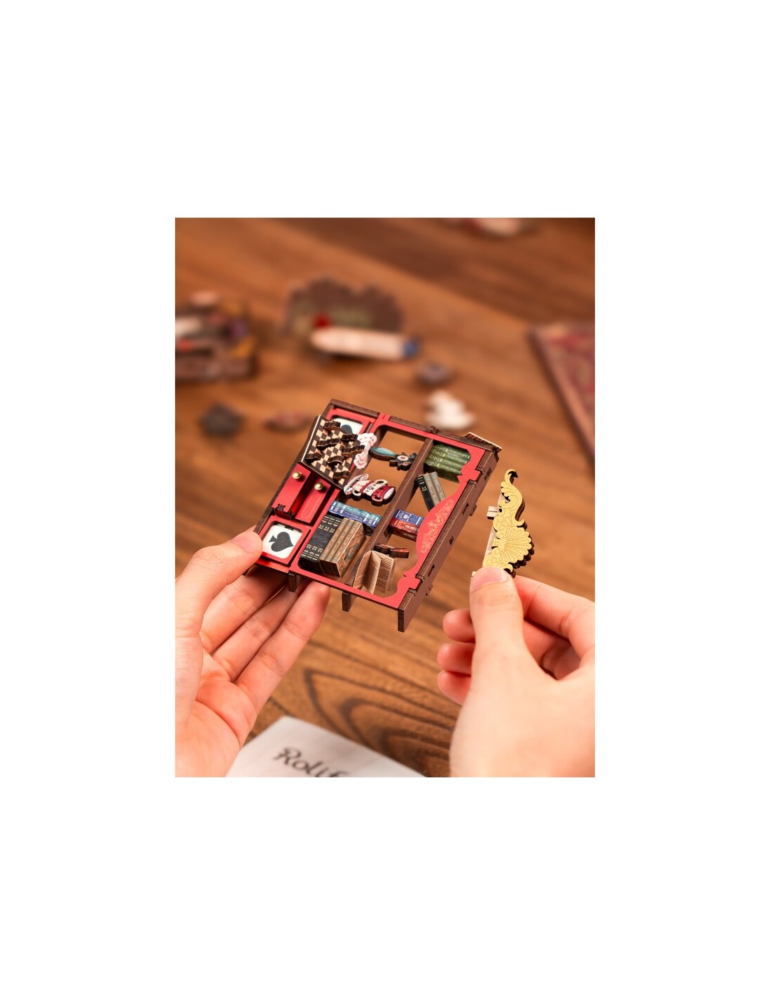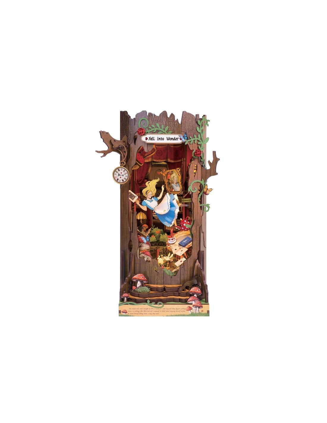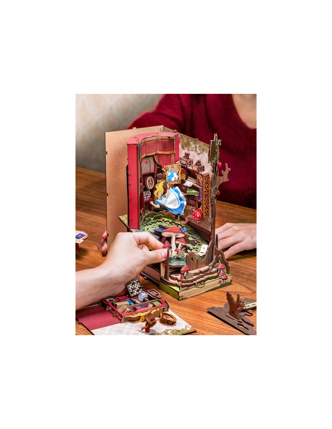 Fall into Wonder es mucho más que un sujetalibros: es un Book Nook DIY de Rolife que transforma tu librería en un portal hacia la fantasía. Cada pieza encaja como un rompecabezas 3D de madera, dando vida a un escenario lleno de detalles encantadores, luces cálidas y sorpresas ocultas.