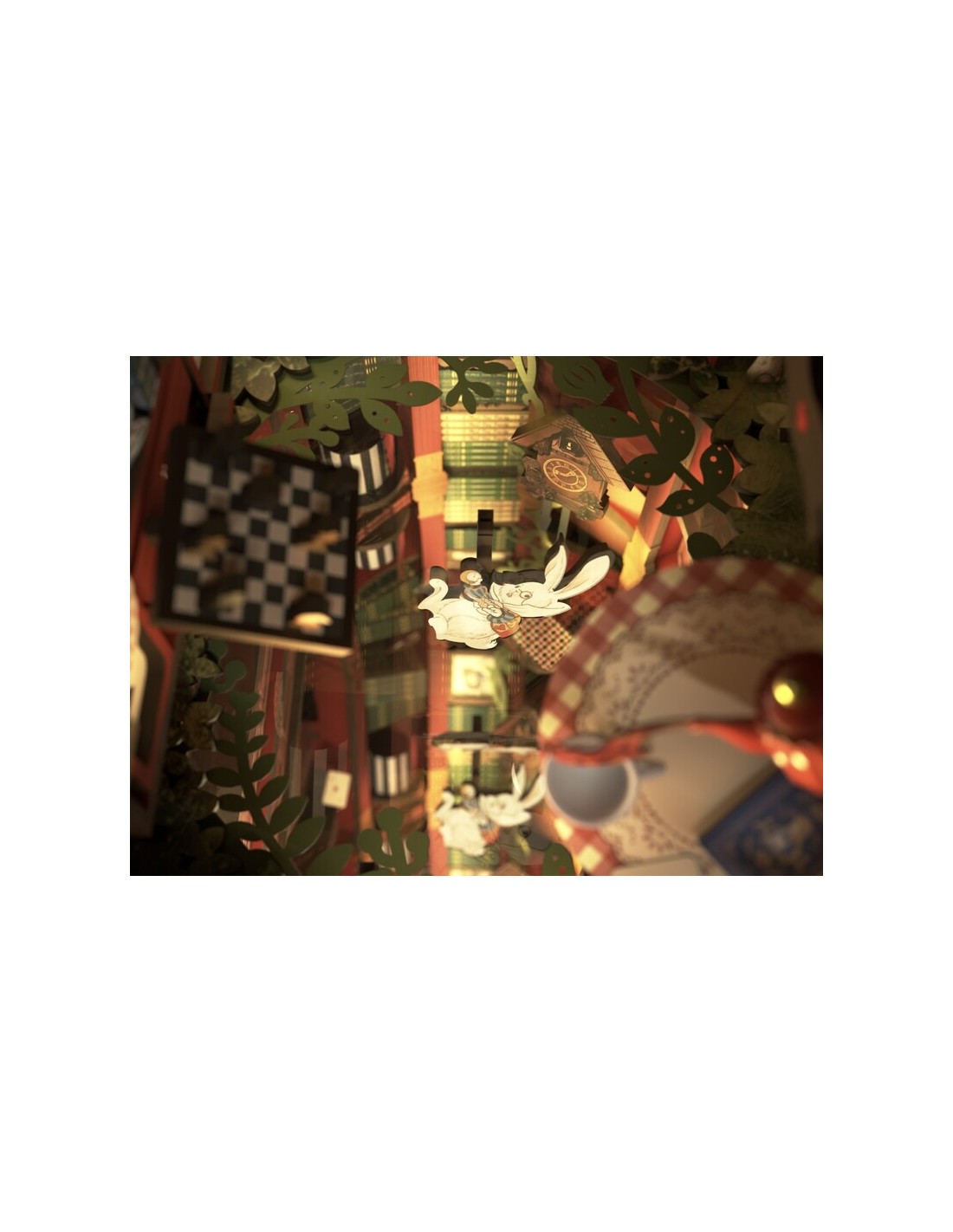 • Diseño de cuento: Relojes que giran al revés, setas interactivas y un espejo infinito que invita a soñar.