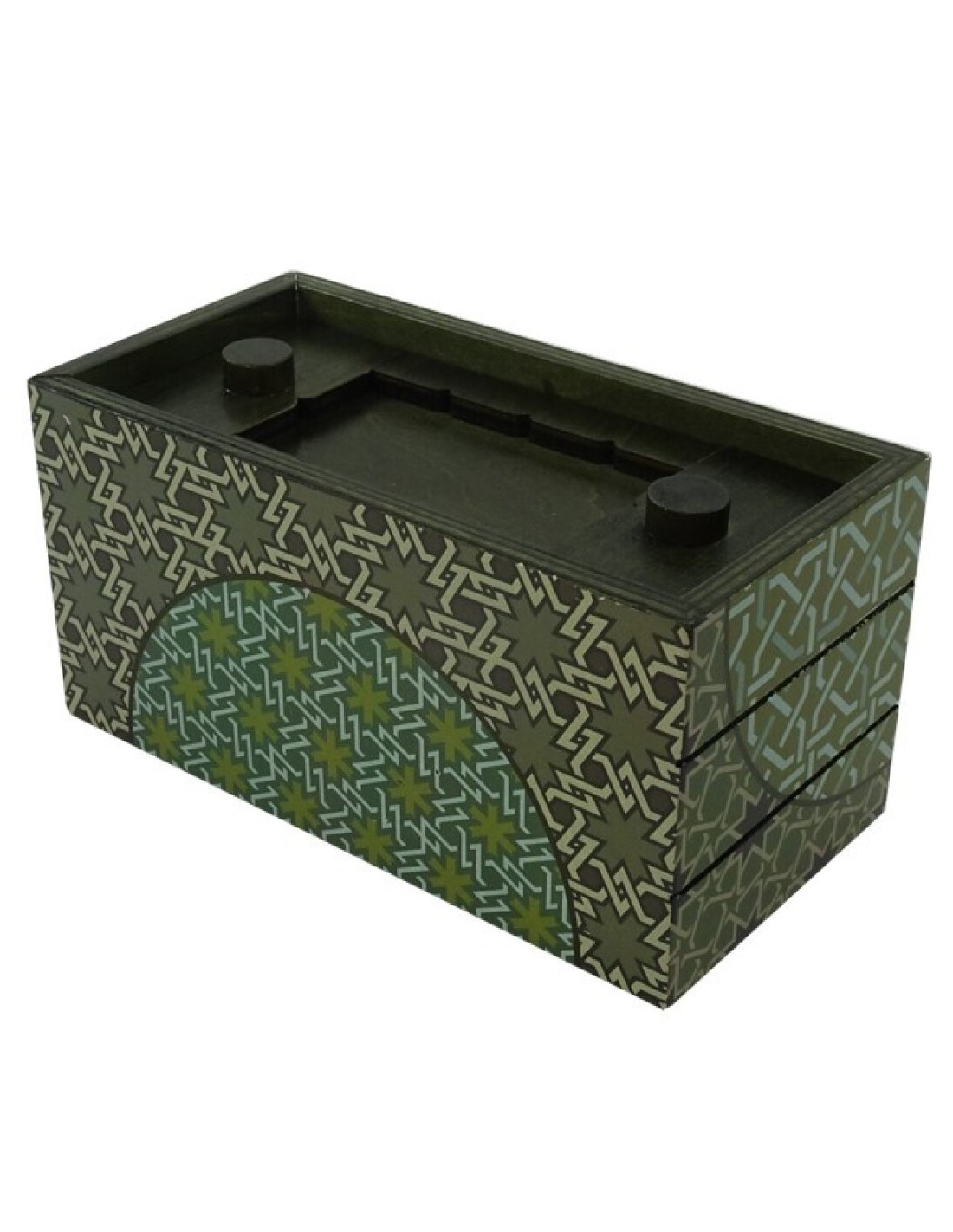 Esta caja tiene un compartimento en la parte superior y un solo cajón en la parte inferior para abrir. La madera está teñida del rico verde oscuro del verano y la transferencia tiene preciosos patrones geométricos en tonos verdes.